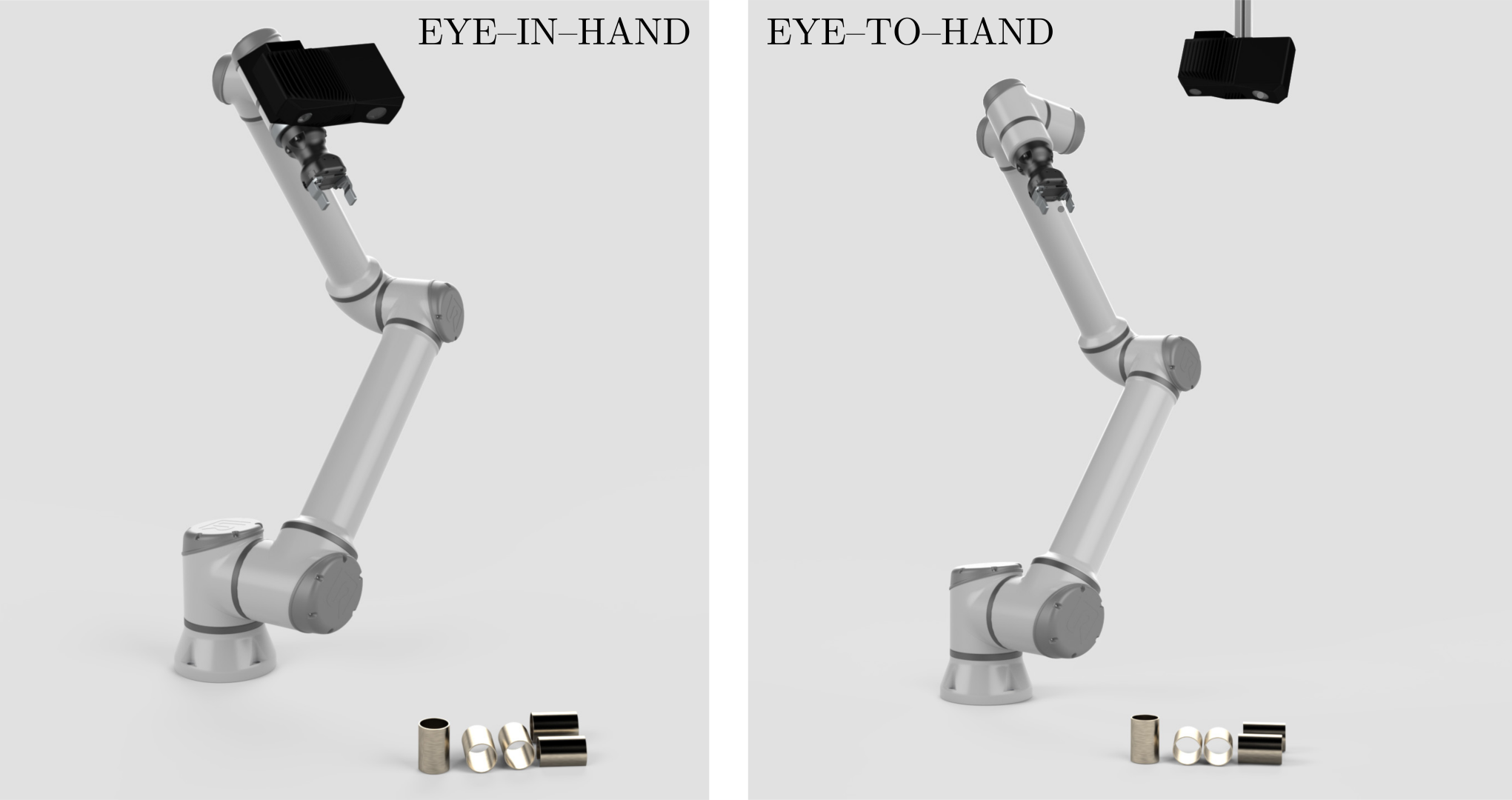当涉及到视觉引导机器人系统中的相机安装位置时,有两种不同的标准配置,”eye-to-hand”和”eye-in-hand”。