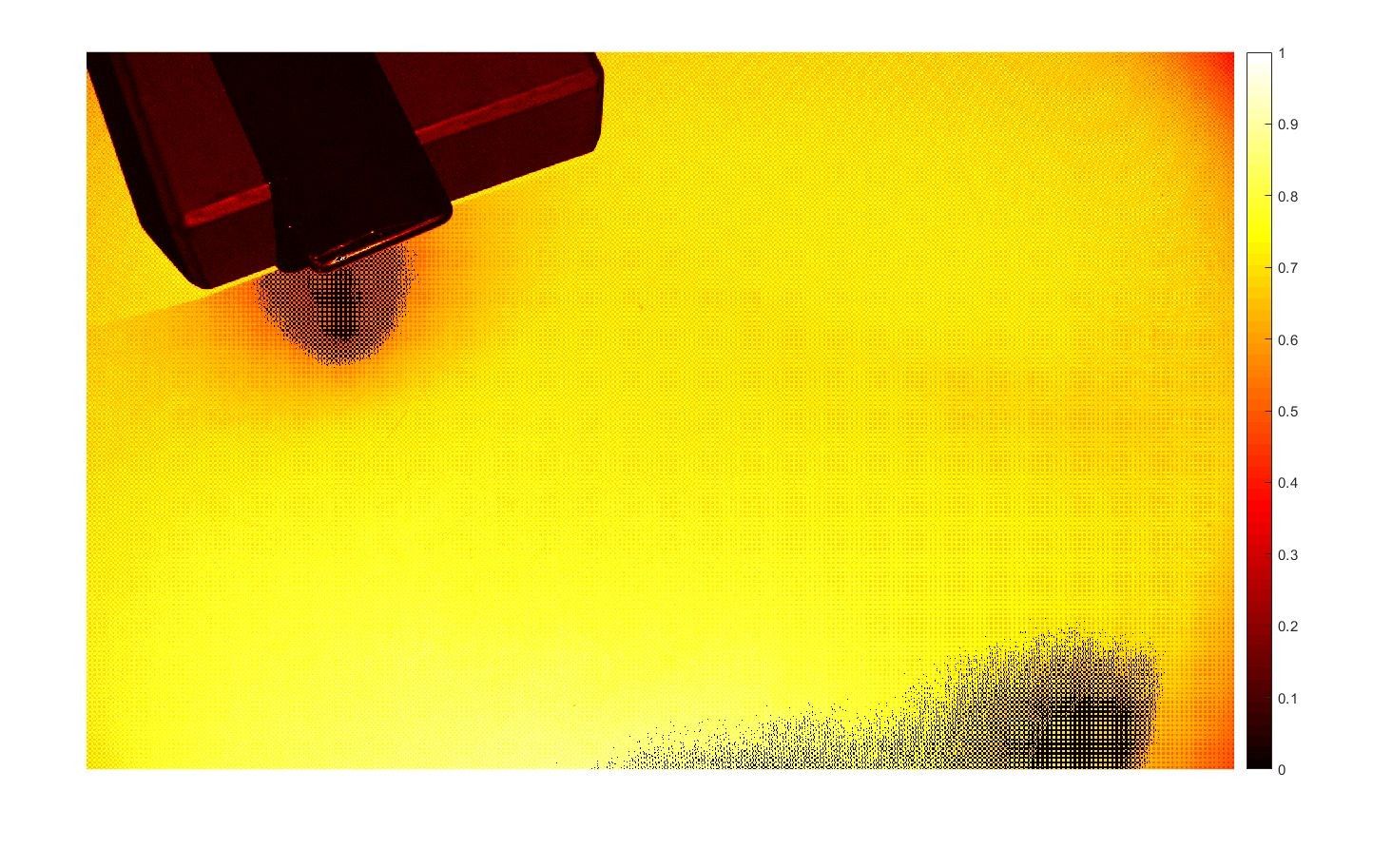 您还可以分析 SNR图像 以获取有关环境光及其对场景影响的更多信息。下图是归一化 (0-1) SNR 图像。在图像中环境光影响较大的区域,SNR 较低。但是,这也取决于材料的光学特性,这就是它在深色智能手机上的数值更低的原因。